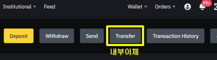 이제 현물 계정에서 선물 계정으로 테더(USDT)를 보내보도록 하겠습니다. 우측 상단 메뉴에서 'Wallet' → 'Fiat and Spot(현물 화폐)' → 'transfer(전송)' 클릭