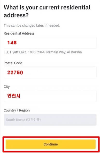 이어서 도로명 주소를 입력하고, 자동완성 되는 주소를 누르고 'Continue' 버튼을 클릭하면, 우편 번호 등 나머지 정보를 입력해줍니다. 자동 완성이 안될 경우 그냥 'Continue' 누르고 수동으로 입력해주셔도 됩니다.