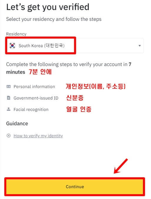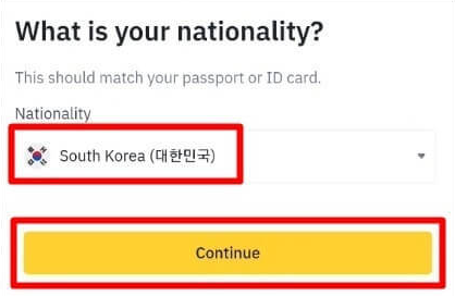 바이낸스 어플을 켜고 조금전에 가입한 아이디로 로그인하면 아래와 같은 창이 나옵니다. 'Verify Now'를 눌러서 KYC 본인 인증을 시작해줍니다. 이어서 창이 바뀌면 국적 부분을 'South Korea'로 선택하고 'Continue' 클릭합니다.