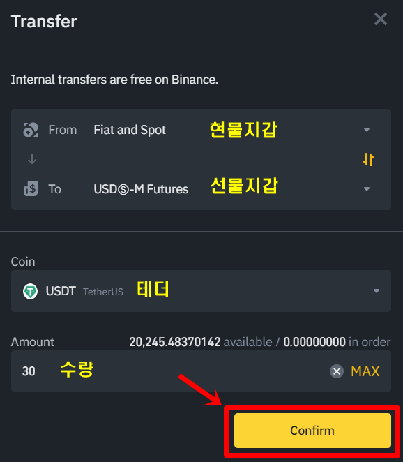 From(Fiat and Spot), To(USDS-M Futures)를 지정하고 보낼 코인(USDT)을 선택하고 Amount(수량)를 적어서 'Confirm'을 클릭합니다.