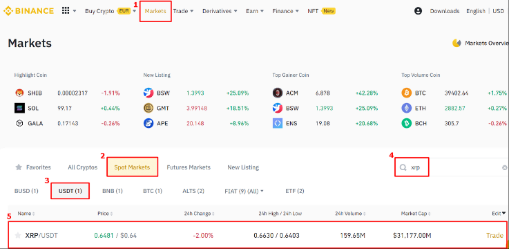 이제 리플을 매도하겠습니다. 'Markets' → 'Spot Markets' → 'XRP/USDT'를 클릭합니다.