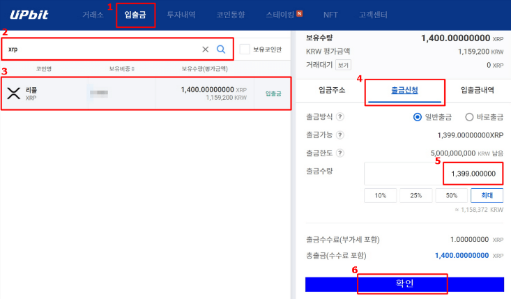 입출금 → xrp 검색 → XRP행 클릭 → '출금신청 탭' → 출금 수량을 입력하고 아래쪽에 '확인'을 클릭합니다. 수수료로 XRP 1개가 소요됩니다.