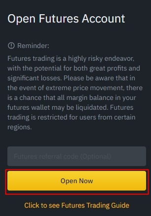 이제 차트가 나타나면서 오른쪽에 보시면 매수, 매도 창 대신 Open Futures Account라고 써진 창이 나타납니다. 선물 계정 생성 정도로 이해하시면 되겠습니다. 아래쪽에 'Open Now' 클릭